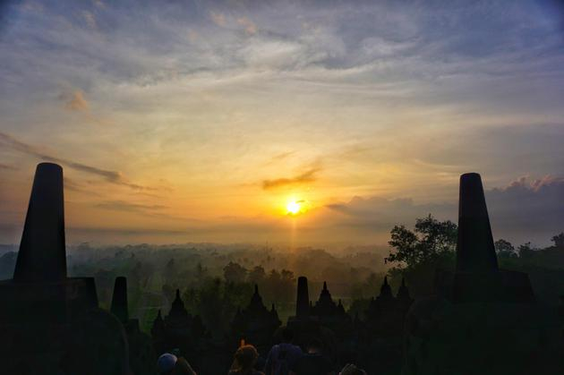佛塔位于印尼爪哇省中部,日惹北41公里,是热门打卡景点。游客在婆罗浮屠看日出,需凌晨四点左右到达,才能占据最佳观赏位置。站在佛塔的高出,等待黎明破晓的一瞬间,晨光下的古城,金灿灿的一片,十分壮观。