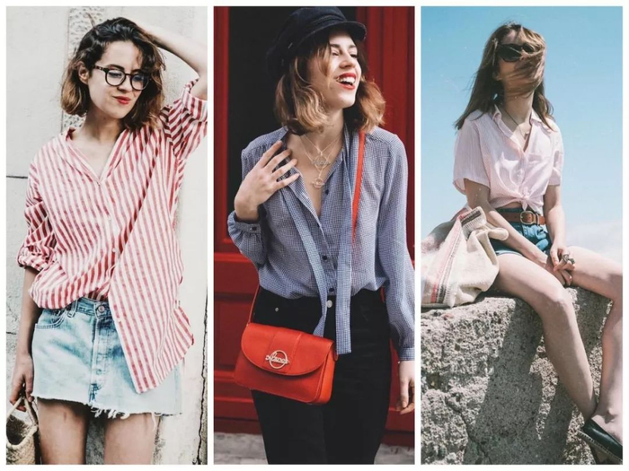 衣摆扎进牛仔里,或者打个结都是很随意的样子,扣子露出颈部小V领的皮肤,略显凌乱,看起来很漫不经心,法式不费力就很时髦穿搭秘诀,就在这些小细节里了。