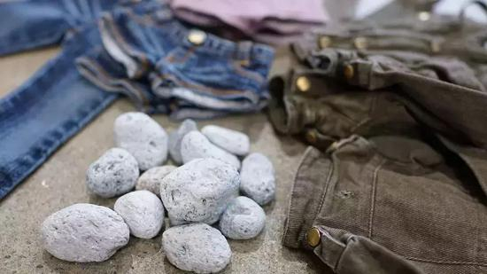 一方面可加强衣物的褪色作用,另一方面也可增强衣物的磨损性,以突出其陈旧感。