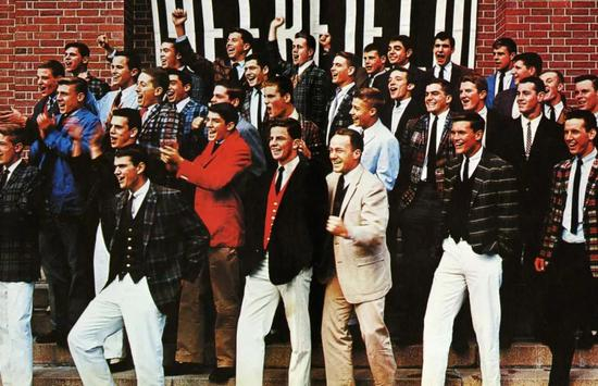套装的着用开始被抛诸脑后,取而代之是衬衫、毛衣的内搭骨架,单西和休闲裤的搭配渐成体系,这些能与普通大学的学生区分开来、兼具了休闲性的半正式着装造型,就被大家称之为 Ivy Style。