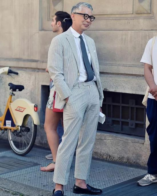 无论是成套着用,还是单西混搭,在他的演绎下都极具风格。明亮的色调和图案将闷热一扫而空,无疑是经典男装爱好者的夏季休闲之选。(假如不喜欢蓝白条纹,现在也有格纹和纯色的泡泡纱面料,大家可以按喜好进行选择)