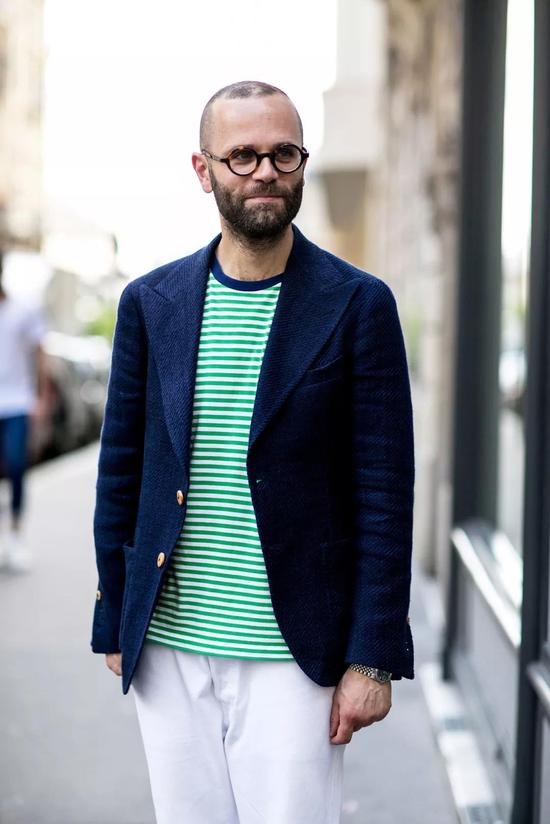 蓝色戗驳领上衣+横条纹T恤+白色长裤是现在多人呈现 Preppy 风格的搭配之一,但比起蓝白条纹呼应主调的保守态度,他就改用了更为大胆的薄荷绿条纹凸显品味。同样的元素架构,轻微的变化就能体现出差距。