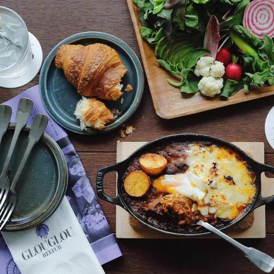 沿着楼梯走上 2 层,就到了 GLOUGLOU REEFUR 餐厅,这间餐厅主打欧式健康轻食,当然也可以来这里喝杯咖啡,享用一块水果蛋糕。