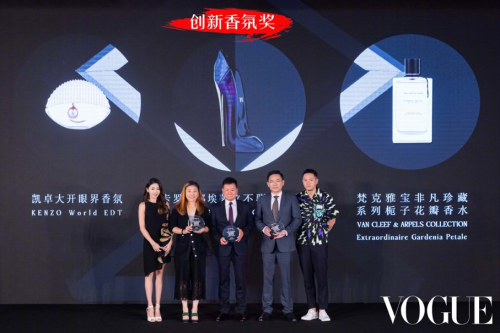 康泰纳仕中国集团运营总监唐杰(Paco Tang)与时尚达人程晓玥共同为凯卓大开眼界香氛、卡罗琳娜埃莱拉不驯女王香水、梵克雅宝非凡珍藏系列栀子花瓣香水颁发了“创新香氛奖”。