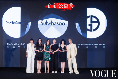 《Vogue服饰与美容》编辑总监张宇(Angelica Cheung)与专业评委明星造型师小P共同为魅可-VIVA GLAM、雪花秀—清华大学雪花秀非遗保护基金、阿玛尼——Aqua for Life颁发了“创新公益奖”。