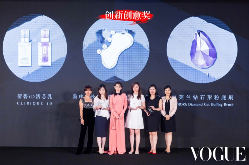 明星评委戚薇与明星造型师淳子、北大第一医院皮肤科主任医师吴艳共同为倩碧iD活芯乳、黎珐珂纱多功能美容仪(迷你版)、丝芙兰钻石形粉底刷颁发“创新创意奖”。