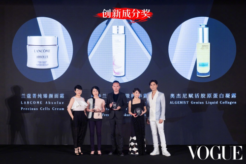 专业评委丝芙兰Sephora中国区总经理陈冰(Maggie Chan)与知名造型师Kevin共同为兰蔻菁纯臻颜面霜、雅诗兰黛樱花微精华露、奥杰尼赋活胶原蛋白凝露颁发了“创新成分奖”。