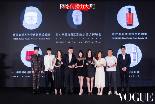 UNINE姚明明与美妆专家尼可、美肤专家家弘共同为馥蕾诗睡莲青春活妍赋活面膜、资生堂新艳阳夏臻效水动力防晒乳、植村秀新琥珀臻萃洁颜油、SK-II微肌因赋活修护精华霜(轻盈型)、倩碧iD活芯乳颁发“网络传播力大奖”。