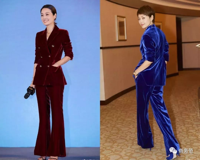 全套的酒红、宝蓝天鹅绒西装,原本不容易驾驭,马伊琍也hold住了。