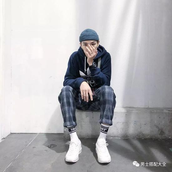 复古的格纹阔腿裤裤搭配卫衣,也可以玩出街头感。