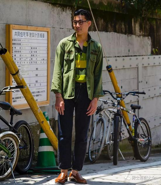 绿色的工装衬衫利用相近的颜色polo打底,充满了层次感。