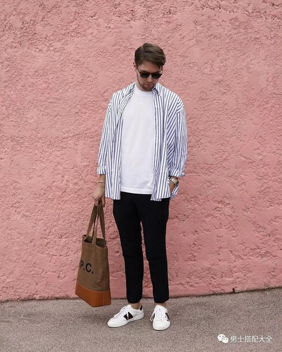 蓝色的竖条纹衬衫,内搭一件白tee,整个人看起来清爽干净。而且竖条纹的排列方式,还能视觉上拉长身高,显得人更瘦。