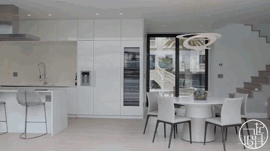 从甲板进去室内,就可以看到一个开放式的厨房和餐厅,橱柜、岛台及餐桌都是白色,配上木制地板,整个空间显得非常干净简洁。