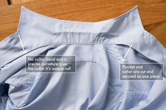通常衬衫领子与其他部分是由几块布料缝制在一起的,但一片领衬衫的领子与衬衫前襟一体,衣领会比一般衬衫领略高一些,且没有领座。