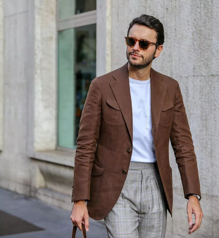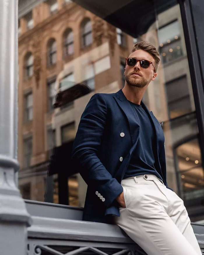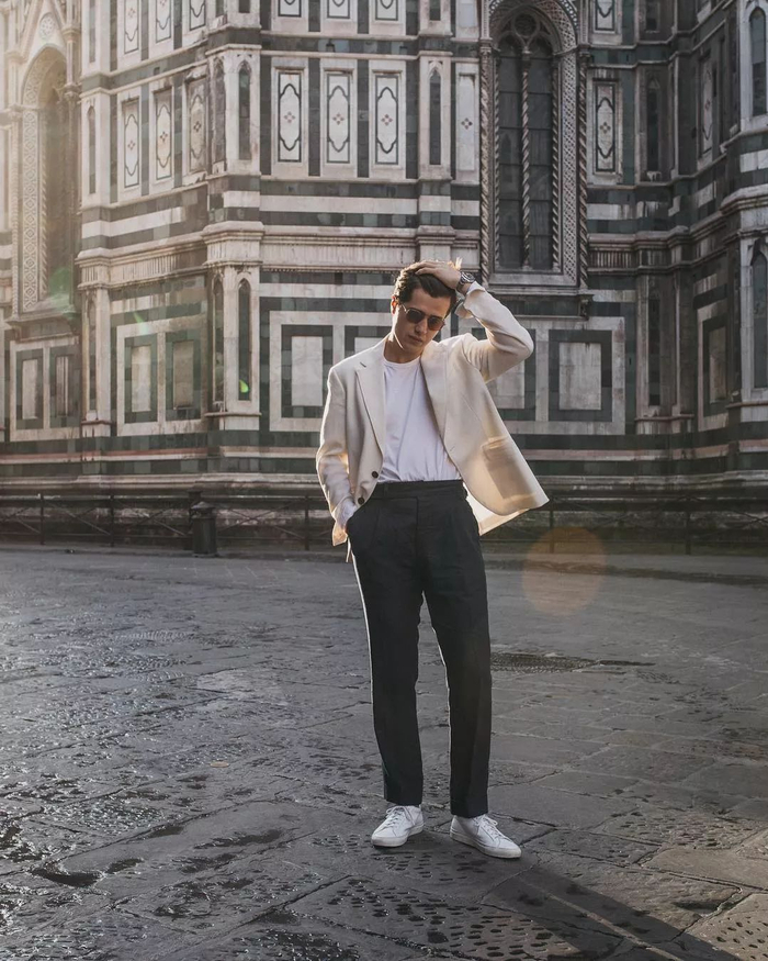 比如深蓝色单西搭配浅米色裤装,奶油色单西配炭灰色裤装,过于相近颜色的上下装会让人以为你没钱买成套西装。内搭建议穿削弱正式感的T恤或POLO,颜色与裤装形成差异,避免穿出连体裤效果。