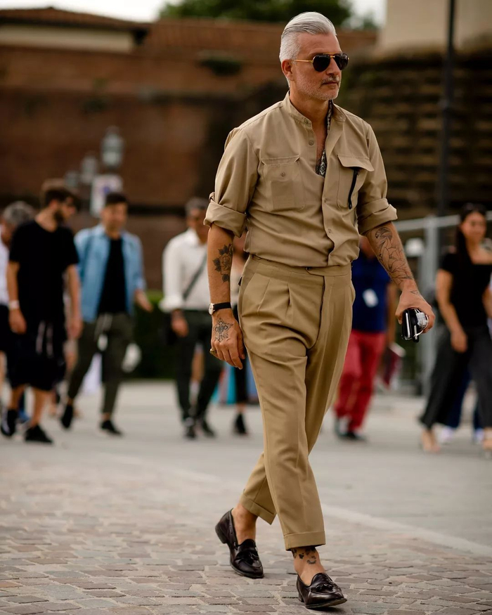平时更偏爱深色上衣的老爷可以挑选深蓝色一片领衬衫搭配商务感弱的浅驼色卡其裤,款式体面,配色休闲。