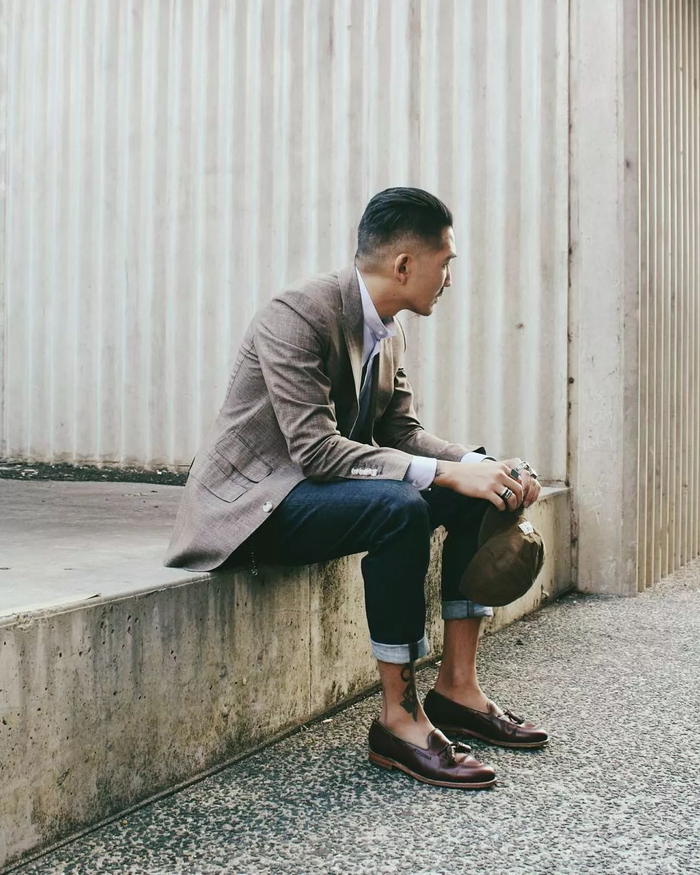 那种西装往往是伦敦梅菲尔区上某些顺应街头风格的老裁缝根据运动鞋,甚至是特定款式的老爹鞋而改良的,一般成衣搭配起运动鞋来还是显得不伦不类。