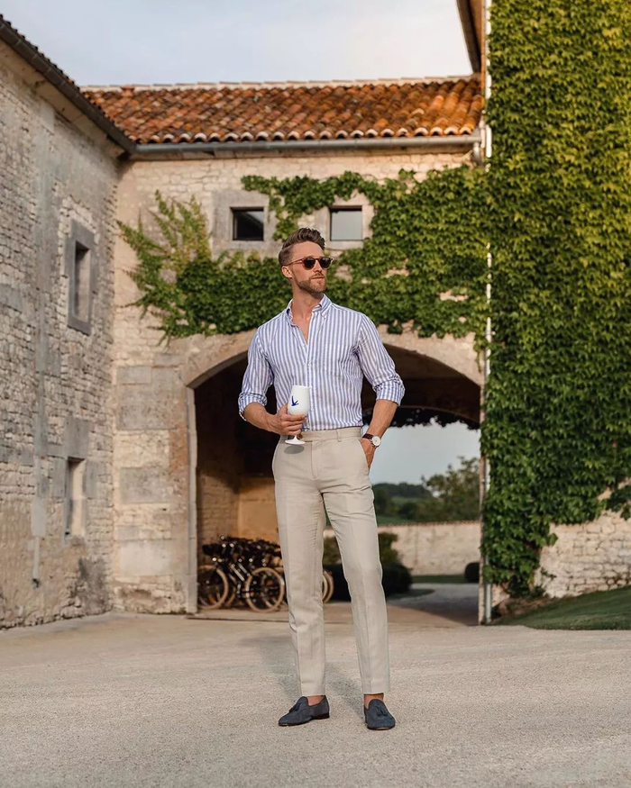 正装裤、卡其裤都能配,鞋款根据所选裤装选择,考虑到婚礼场合,建议穿着条纹一片领衬衫,可以是浅紫色、浅蓝色或者粉色条纹,搭配平时上班穿的深色西装裤和皮鞋都不会太一本正经,如果鞋柜里刚好有双麂皮乐福鞋的话一定换上,看起来会更有腔调。