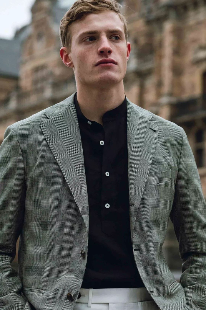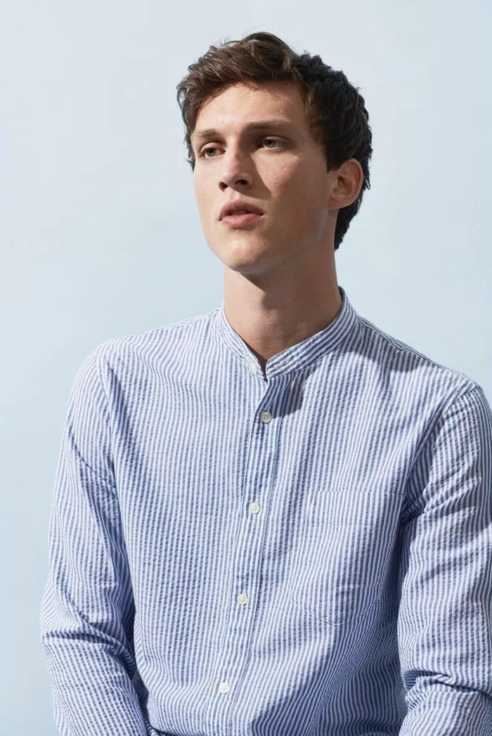 搭配上,浅色立领衬衫能跟牛仔裤一起穿出雅痞范儿。还可以尝试纯黑色搭配浅色裤装,或把深蓝色青年布的立领衬衫穿在西装套装里,没有了翻领设计的深色衬衫在婚礼场合都不会太闷。