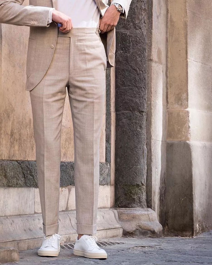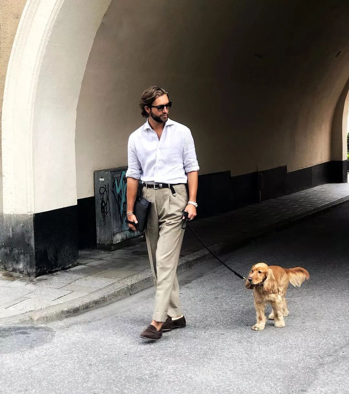 如今的绅装圈,不仅正装裤有裤线,斜纹棉布裤和亚麻长裤也常有带裤线的款式。