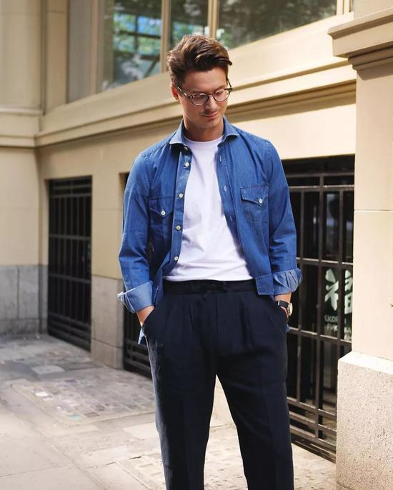 很多老爷以为牛仔类服装只有明晃晃蓝色,是个牛仔就往身上怼。结果就是黑皮肤显得更老,白皮肤显得更娘,怎么看怎么不适合,问题就出在没有根据自己肤色选择牛仔外套的颜色。