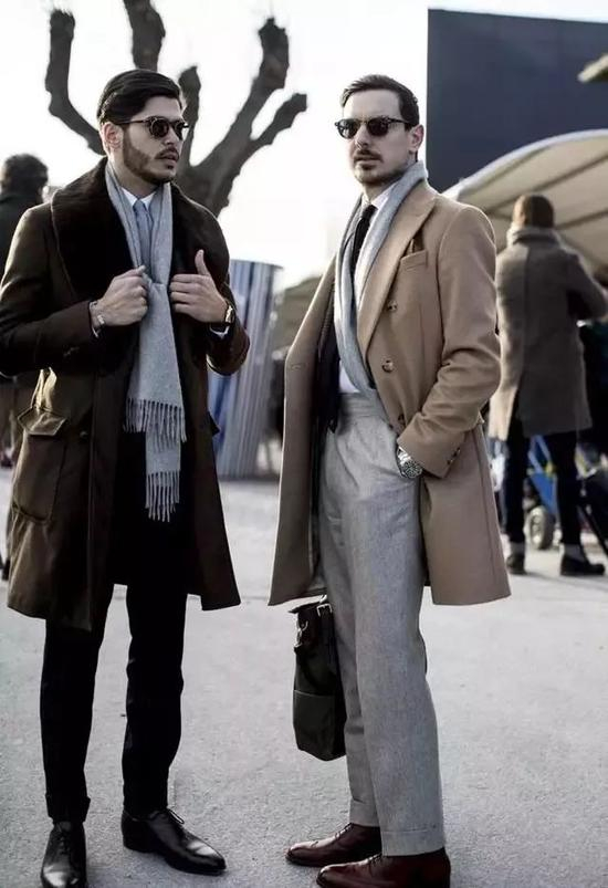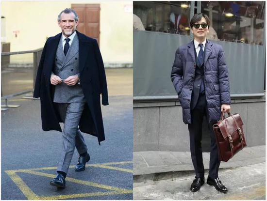 如果你是商务人士,大衣正好能诠释成熟、稳重、优雅的气质。现在很多年轻人爱用羽绒服和棉服来和西装混搭(下右),这种混搭并不合适成熟男性,大衣才是西装的最佳拍档。而且大衣的面料多为羊毛、羊绒,高品质呢绒面料观感贵气,显身份。