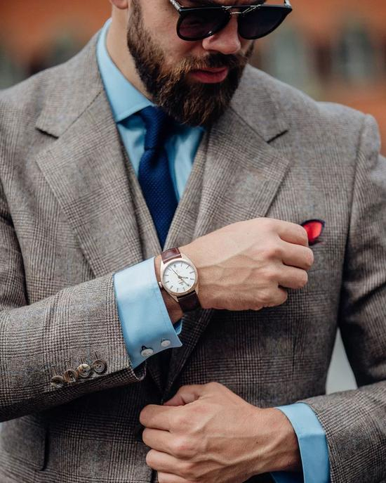 因为秋冬季节穿的衣服一般以长袖为主,袖口大小通常不会太大。如果戴一快像沛纳海那么厚的表,要么卡袖,要么只能挽起长袖,以此来让袖口和手表处于一个从容的状态。