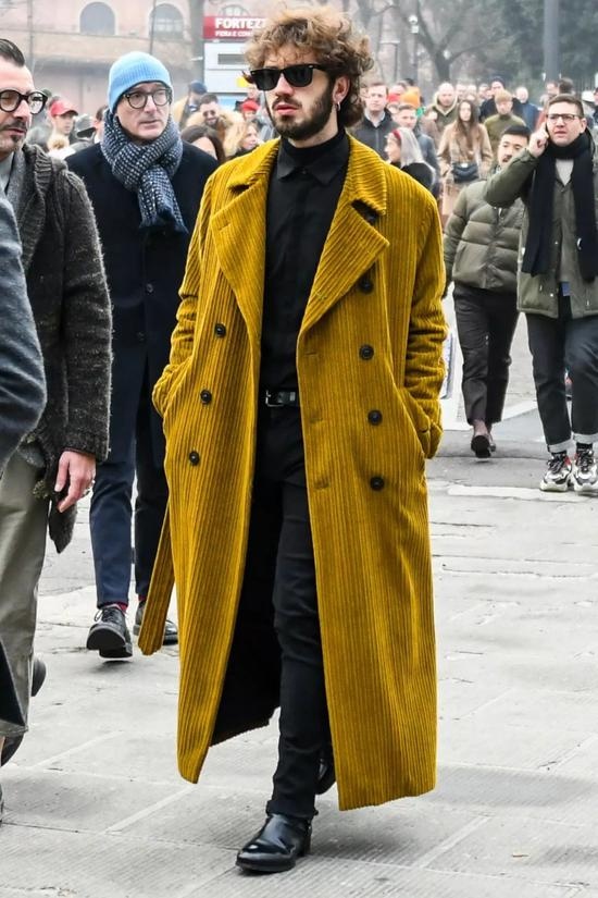如果是肤色偏白的型男,也可以考虑一下用白色内搭来和脏黄色大衣搭配一起,这时候因为白色通透感的作用效果,减弱了脏黄色复古表达,反而令黄色造型清新明亮了起来,更有新颖感。