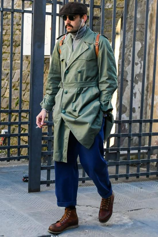 要是觉得气场不够,这时候便不妨加双靴款了。军绿堑壕风衣+靴款的组合,在表现气场上不像标准军装加靴款那样复古霸道,却也会拥有了足够的型格支撑,在满足了军事风的力量需求的同时,发挥出了风衣本身的轻盈特点。