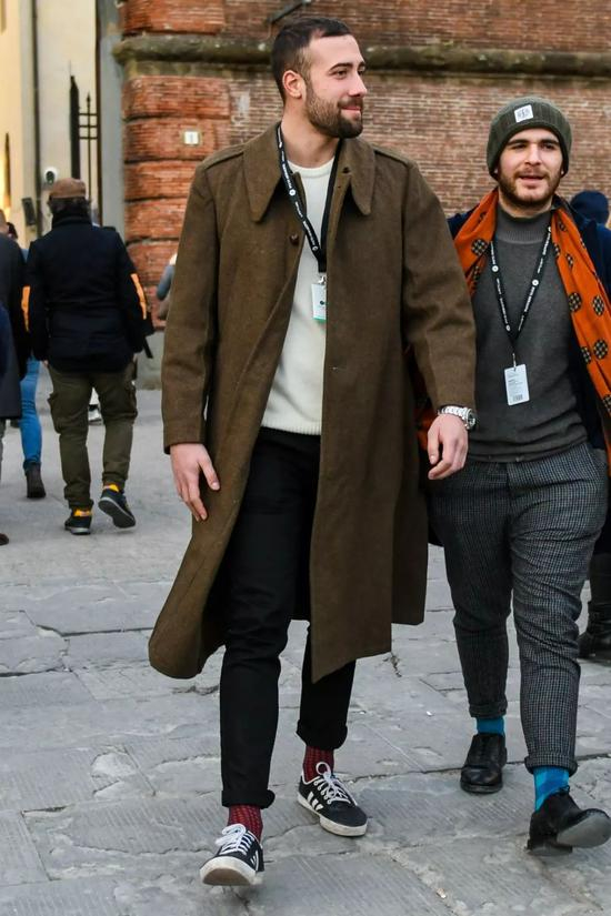 这样做的好处在于,跟 M65 以及派克大衣相对,这些普通款的军绿色大衣风衣可以避免一味粗糙硬朗的过度军事感觉,但又不丢失军事风格的特有硬汉阳刚的格调。说白了,也是为了留出“空间”,不过不是在颜色质感中,而是在风格表现上,以便带来更多的可能性。