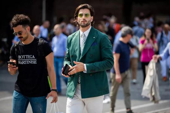这时候,如迪厅的年轻社交场合中,无论是单间夹克还是套装都以奇怪艳丽的色彩著称,而绿色西装就是其中之一。只不过现在,更多时候我们真的只能在 Pitti Uomo 上看见它。