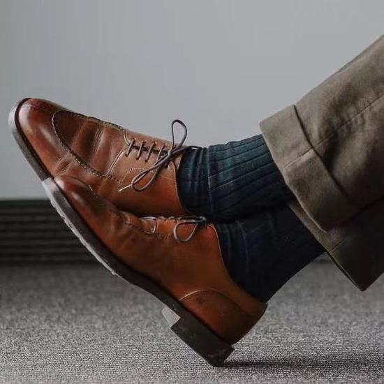 袜子:很多男士一身好看的搭配,最后被一双袜子全都弄毁了,最简单保险的方法就是,选择一双与裤子同色系的袜子。如果觉得单调的话,还可以选择一些经典的条纹、圆点、菱格等。