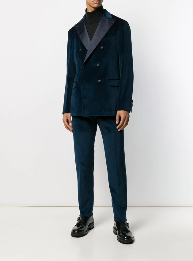 有些人可能会觉得丝绒材质的礼服只能在年会这种场合穿,如果考虑到实用性,那保守的羊毛质地西服绝对再合适不过了。