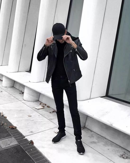 在全黑的造型中内搭连帽卫衣也能变得更加时髦,加上一件具有光泽感的机车夹克整体也很丰富。还有在鞋子的选择中,厚底的运动鞋也能让你显高几公分,梳起背头造型一样自信满满。
