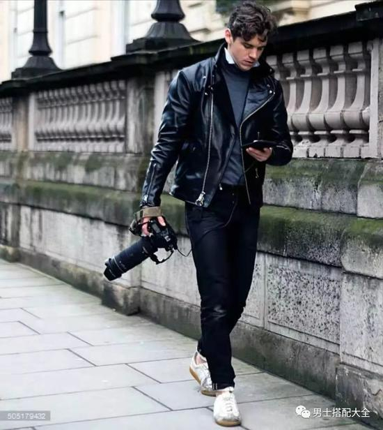 衬衫加骑士皮衣外套的叠搭表现,使衣着瞬间拥有丰富层次。