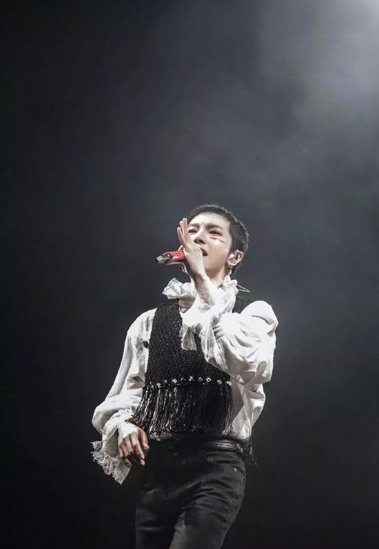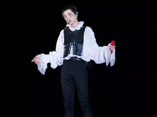 华晨宇在前段时间的火星演唱会中,像极了从黑暗中飞出的少年,身穿白色花边长袖衬衫搭配黑色针织马甲,唱着《疯人院》的他优雅从容,仙气满分。