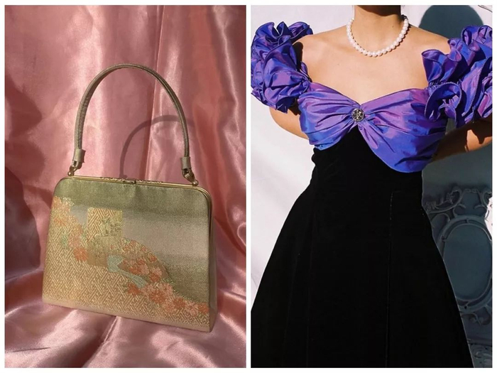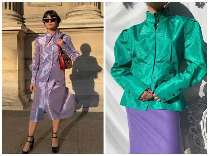 她自己最常穿生丝和缎面,尤其是水波纹丝缎。现代品牌里极少见,基本只能在古着里找到👇。