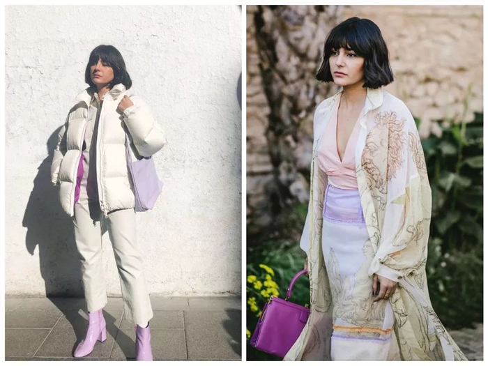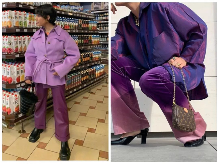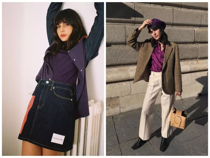 全身紫色一般人还蛮难驾驭的。Miss 烧饼更建议姑娘们选择一件紫色单品作为风格单品,搭配基础的黑白灰👇;