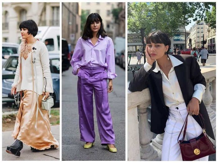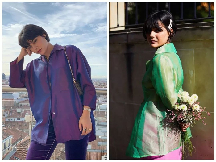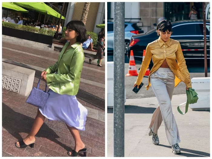 而缎面单品中,衬衫,尤其是大尖领衬衫尤其推荐。不仅显脸小、显气场、百搭好驾驭,还是2020年大势单品。