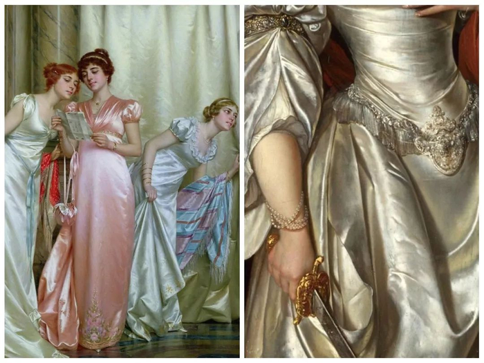 一副来自19世纪意大利画家Vittorio Reggianini的《Letter Post》,一副则来自埃格伦范德。内尔的《Judith》,穿的都是丝缎裙。