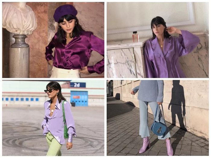 她的ins里,有好多紫色系造型。从浅紫、深紫,到蓝紫、薰衣草紫,几乎所有类型的紫色,她都穿过。。。
