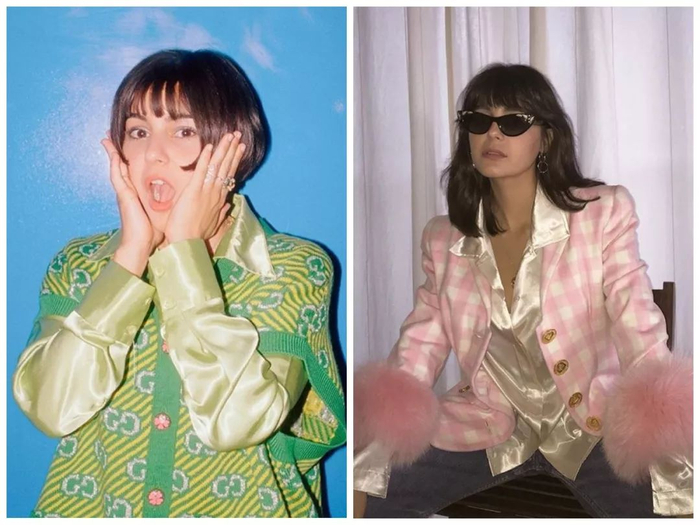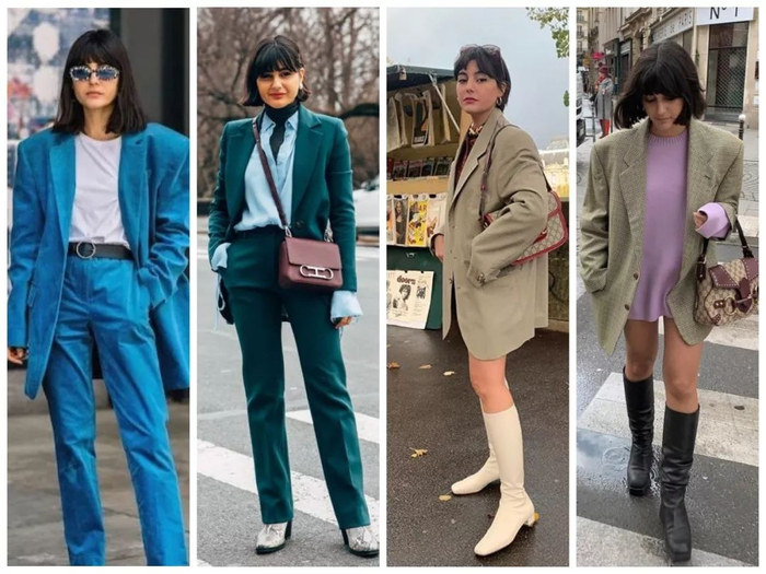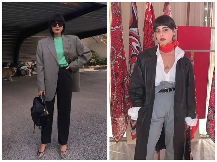 而且,她还会尽量选择oversized款。一来,宽宽松松的版型,能有效增加复古感;二来,大大的廓形,会让她觉得更有力量。