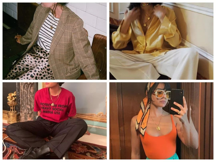 她自己最常戴的是钱币项链。从条纹、丝缎衬衫,到T恤、吊带,统统都能hold住!