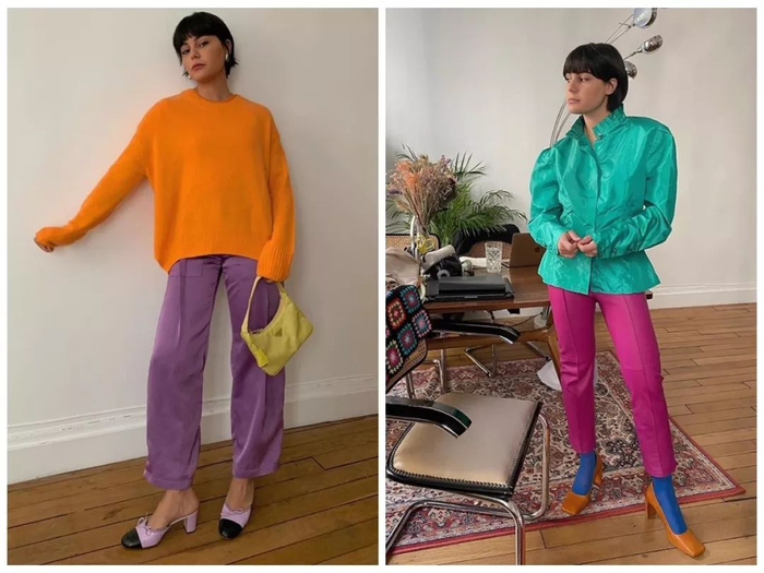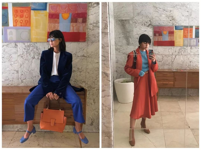 除此之外,红、绿、黄、橘。。。也都是María Bernad经常穿的颜色。一般饱和度偏高,还都是高难度撞色,通勤场合最好谨慎尝试。