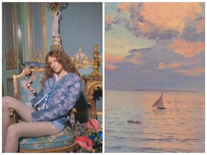她还经常从艺术作品中找配色灵感,这个办法也很值得参考。下面这两身,配色其实都来自她背后同一幅画哦👇~