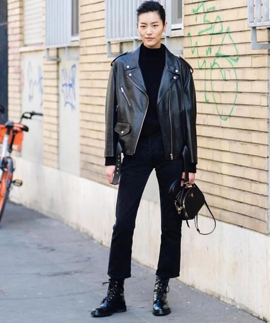 紧身打底裤是保守的选择,黑色紧身裤搭黑色马丁靴,同色显瘦,视觉上还能够拉长腿的比例,显得腿笔直笔直的。