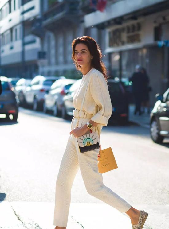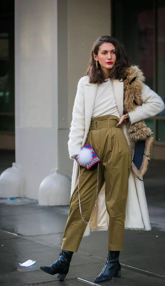 休闲款的高腰裤一般都会自带腰带,乖乖把它们系上就好,除了同色搭配之外还能再次提高腰线,两米长腿不是说着玩的哦!