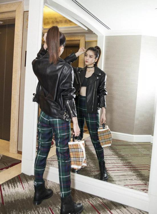张雪迎以黑色机车夹克,内搭黑色运动背心加格纹高腰裤,相比其他纯色的各式高腰裤,绿色格纹款则更加吸睛,时髦指数UP。