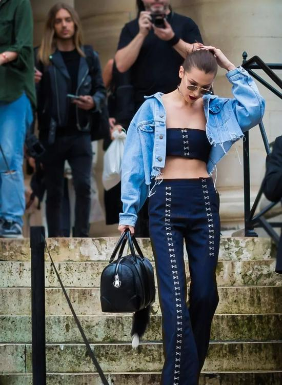 一整套的高腰裤最好穿,当你不知道穿什么的时候,穿一整套绝对不会出错。很多品牌会将高腰裤的整套搭配分为:短TOP吊带+高腰裤、Or西装外套+高腰裤,这两套搭配正是Bella Hadid的最爱~