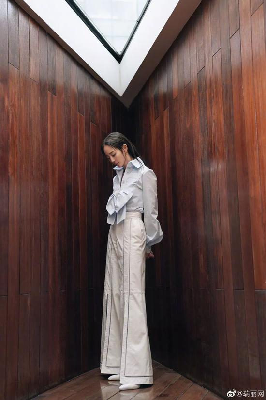 张钧甯穿着蓝色衬衫搭白色高腰阔腿裤,一秒穿越回1980年代,复古高腰裤的前开衩设计使造型更加大胆前卫,满屏大长腿~